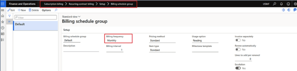 Now we will setup billing schedule group. It consist of a lot of options, but we will be covering those options in details in coming blogs. for now, we will setup billing frequency as monthly. this setup will be needed in the next step.