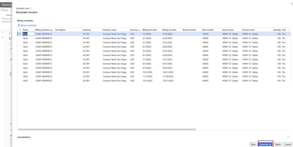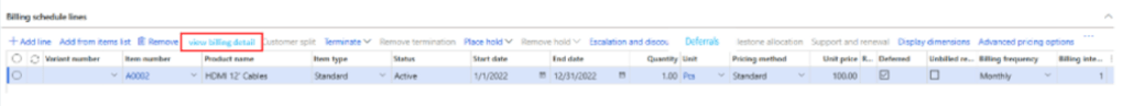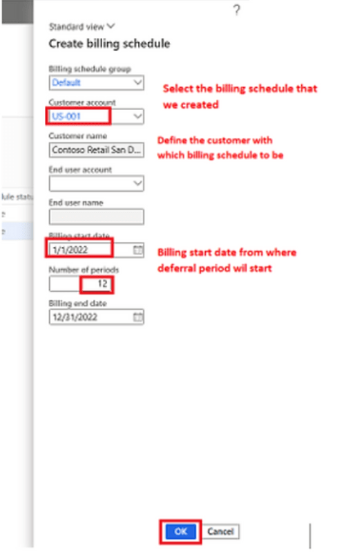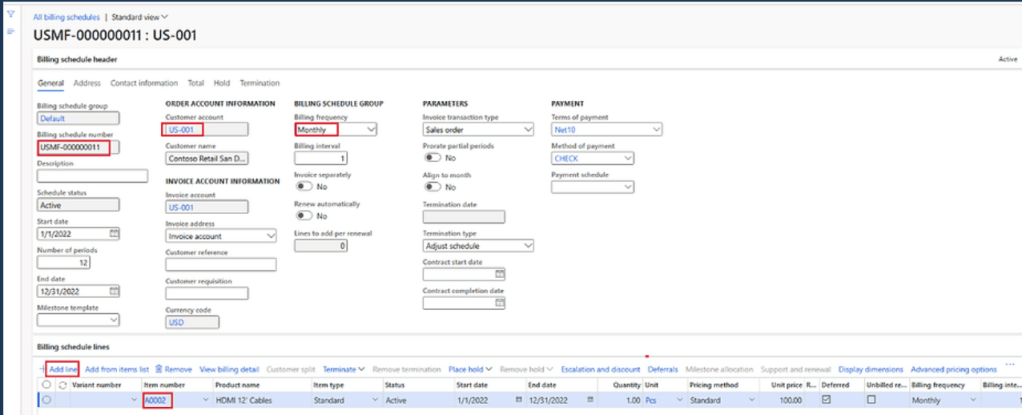 We need to make selection of billing schedule group, customer, start date and frequency. Frequency periods will consider billing frequency setup in billing schedule group to autofill the end date. As I’ve selected Months in billing schedule group and type in 12 in number of periods, it consider 12 as 12 months.