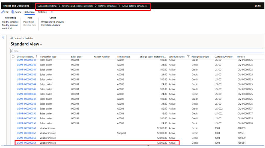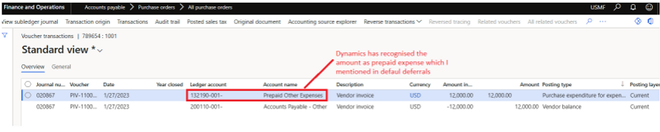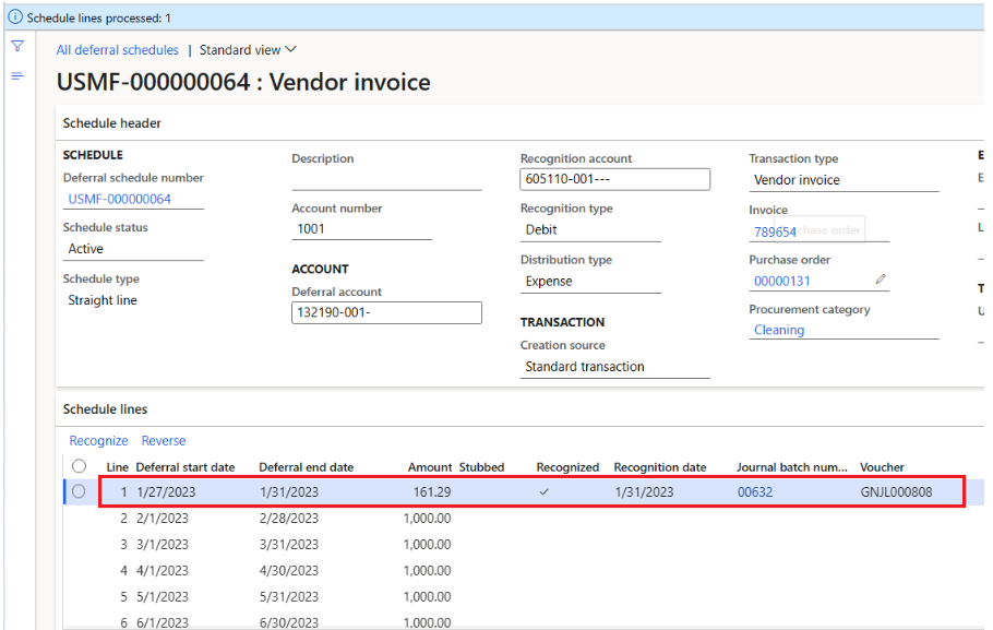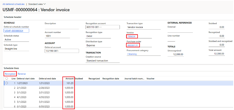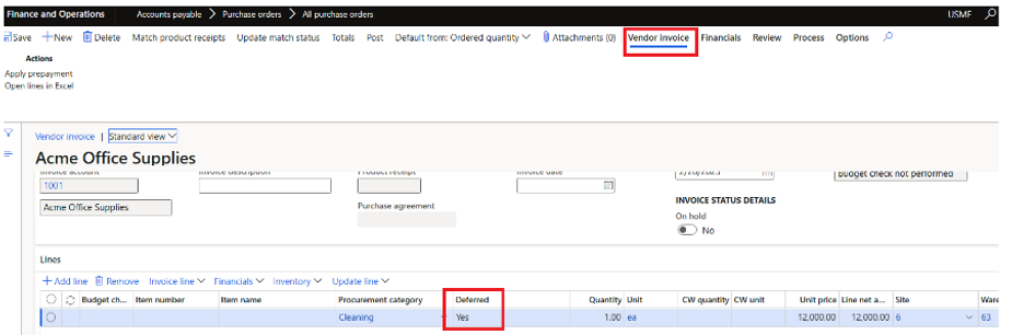 Dynamic has fetched the relevant Invoice number and PO number. we can also see that it has automatically created a deferral schedule.