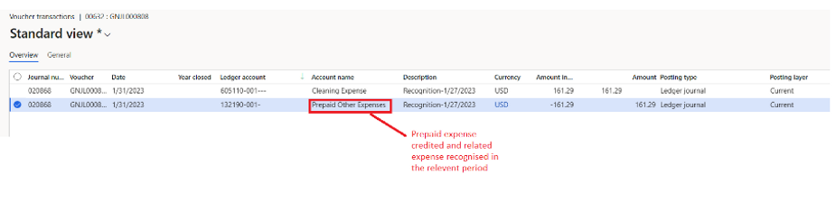 By using dynamics functionality, we will try to record this amount as prepaid expense at the time of PO invoice and then at the end of every month we will run a recognition process to reallocate prepaid expense to cleaning expense.