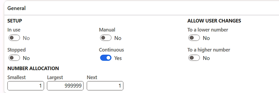 In Continuous, system assign the number for you on master/transactional record. There are no gaps in the number sequence in this method. In my scenario I’m marking continuous as yes