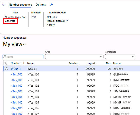 Number Sequence form will open. In this form we can see number sequences generated in all other legal entities. But to generate number sequence in our legal entity click on Generate.