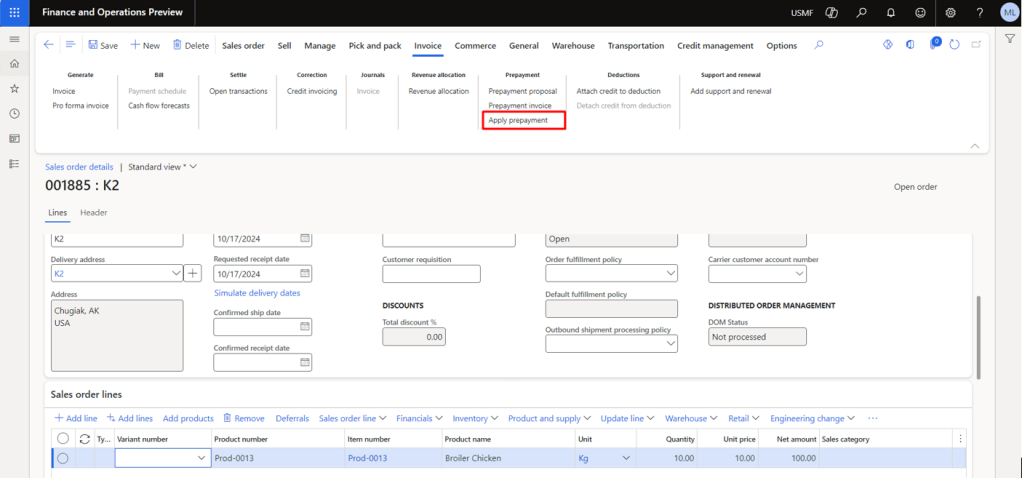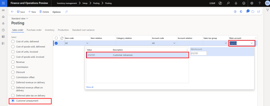 Here, you will notice a new posting type in the Sales Order Tab of the page that says “Customer Prepayment”. Select an appropriate Main Account by confirming the finance department. In our case, its “Customer Advances”.