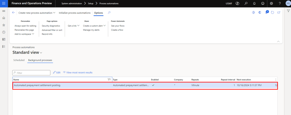 We need to setup “Automated Prepayment settlement posting” background process. This will be used for the settlement of applied prepayment and the actual invoice. Navigate to the system administration > setup > process automations and schedule the above mentioned background process while setting the interval as per your requirement.