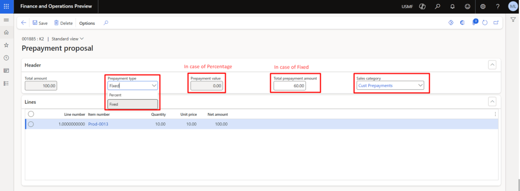 Select the Sales Category, Total prepayment amount or Percentage Value and the prepayment type (In our case it’s Fixed) and click Save