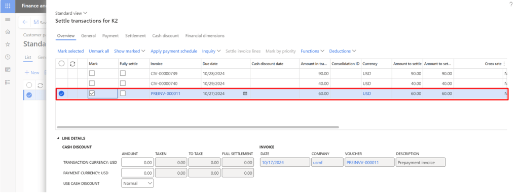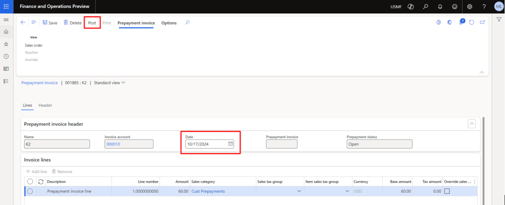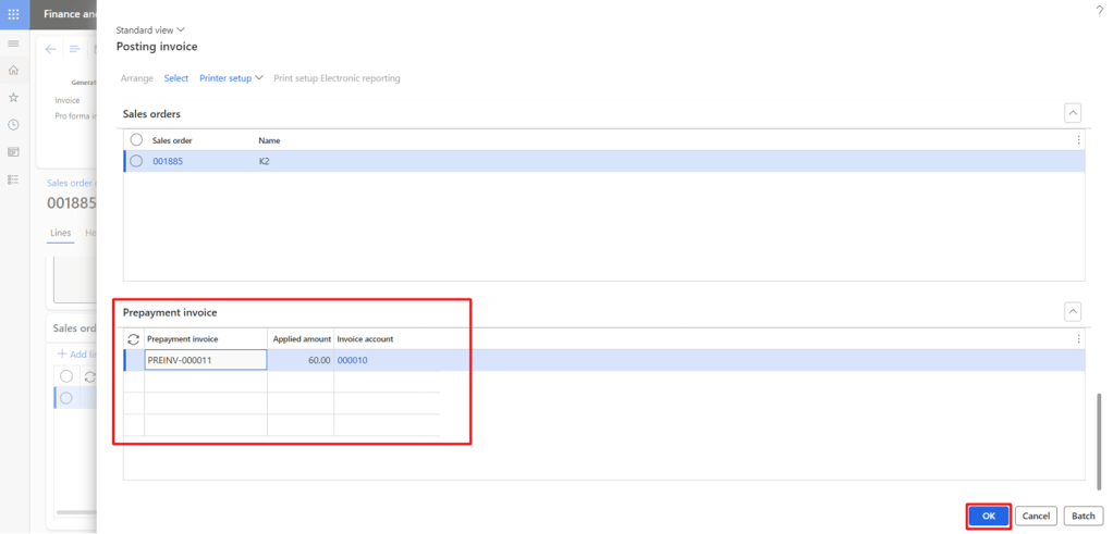 Before posting, you will notice a new fast tab “Prepayment invoice” where you can check the Applied amount column that represents the Prepayment that has been selected for application with actual invoice. After verification, click OK to post the invoice