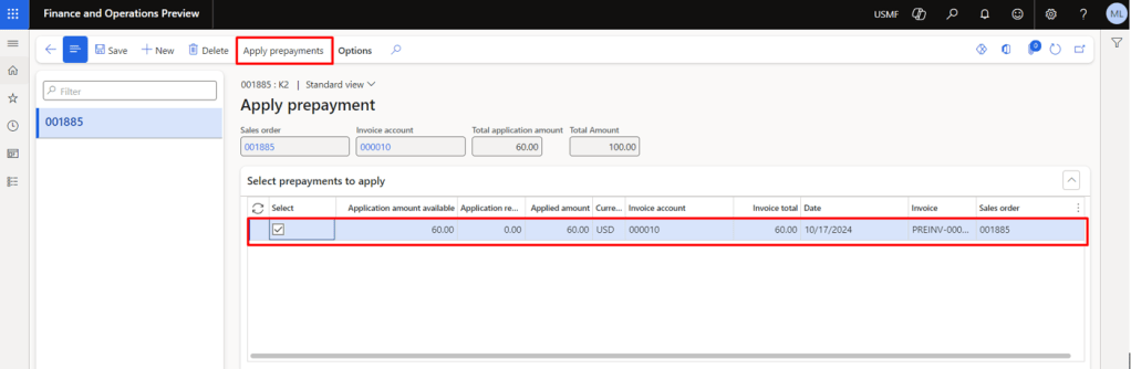 Now we need to click on the Apply Prepayment button under the Invoice Tab so that the required Prepayment can be selected for application whenever we create the actual sales invoice