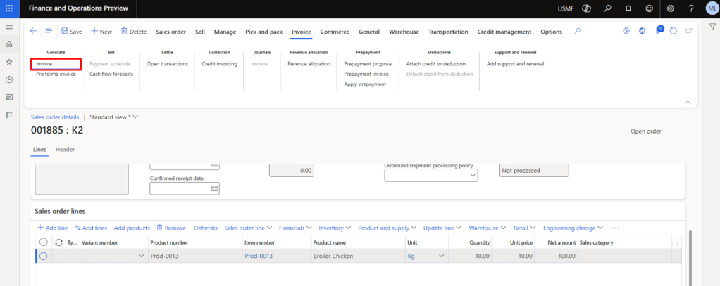 Now, we will be recording the actual Sales Order Invoice by navigating to the Invoice Tab and clicking on the Invoice