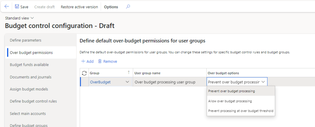 - Allow over budget processing. It will allow the user group defined to post transaction even if budget is fully consumed