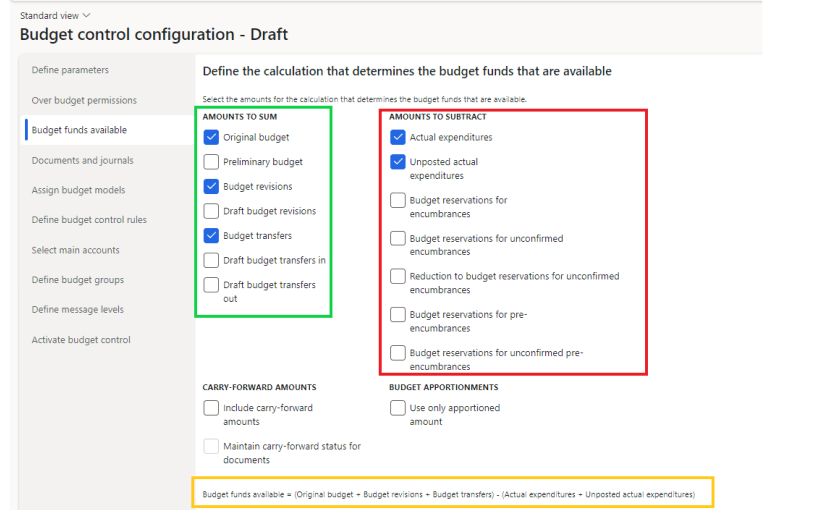 In Red box we will select which transaction will consume our budget. I’ve selected actual expenditure (Posted) and unposted actual expenditure (created but not posted). These red box checks will sum up together