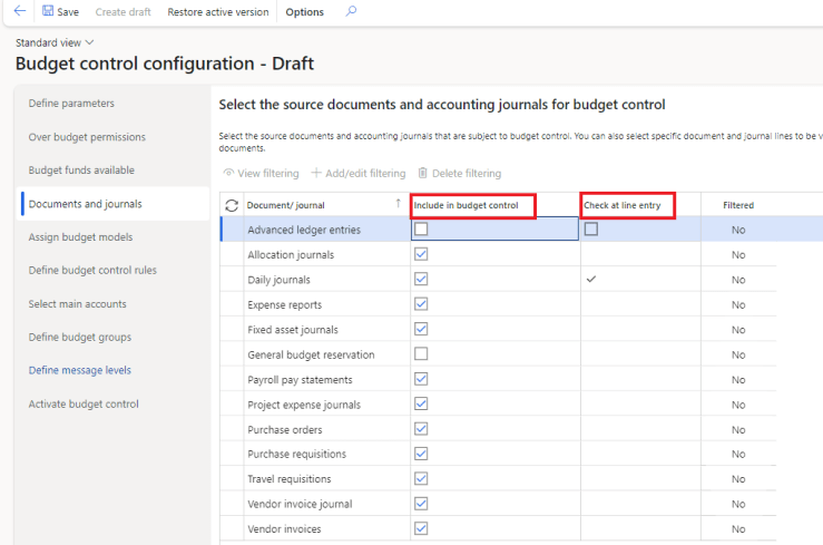 In Document and Journal, we will select that on which document we want to apply this budget control. Under Include in Budget control we will mark the require documents.
