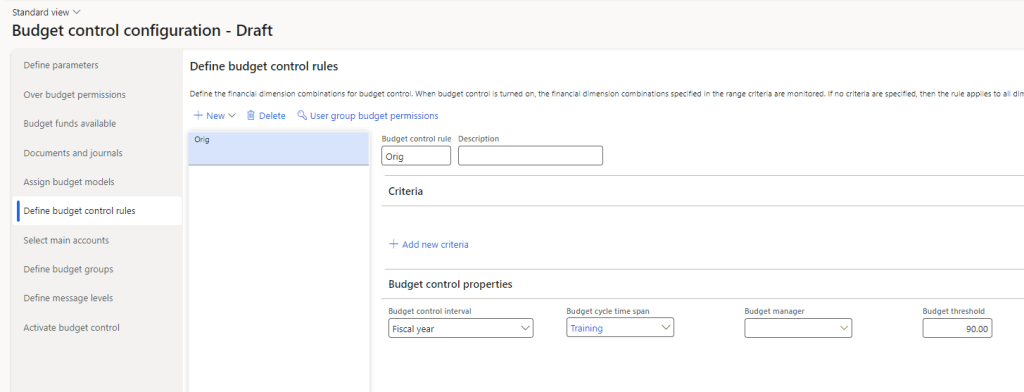Create a budget control rule. if there is a focus on the expenditure or range of expenditures for a department, you can use the settings on this tab to define and evaluate those expenditures. I’ll leave criteria as blank