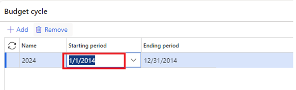 In the budget cycle grid, we will give a name and starting period will be the first date of fiscal year that I want to make budget for. Once I select it my ending period will be auto populated