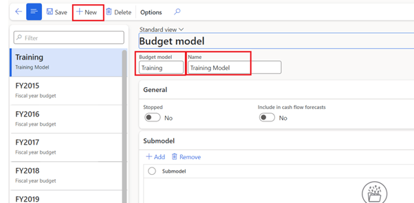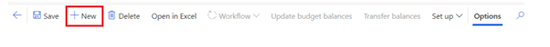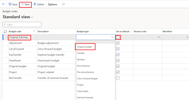 Click on New, In Budget code type a name, We can enter a description to define the budget type and in Budget type we have multiple selection available in drop down