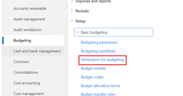 Budgeting > Setup >Basic Budgeting > Dimensions for budget