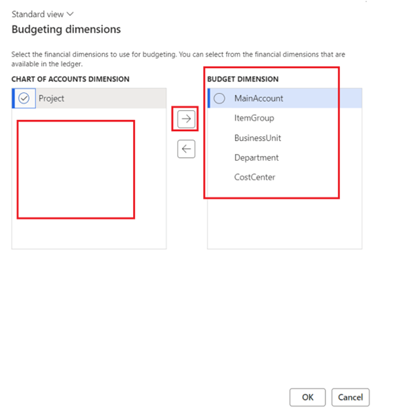 - In the Budget Dimensions grid, you’ll see the dimensions defined in the Dimension for Budgeting setup. To apply budget controls to a specific dimension, you’ll need to move it to the right side of the Budget Control Dimensions grid