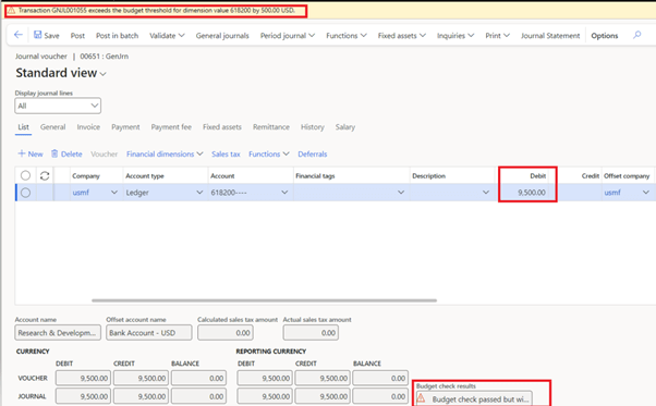 As I’ve budget of 10,000 for Main account 618200 and entered 9,500 in Daily journal. It is withing our budget but exceeding the 90% threshold. So the budget check will pass but a warning will popup