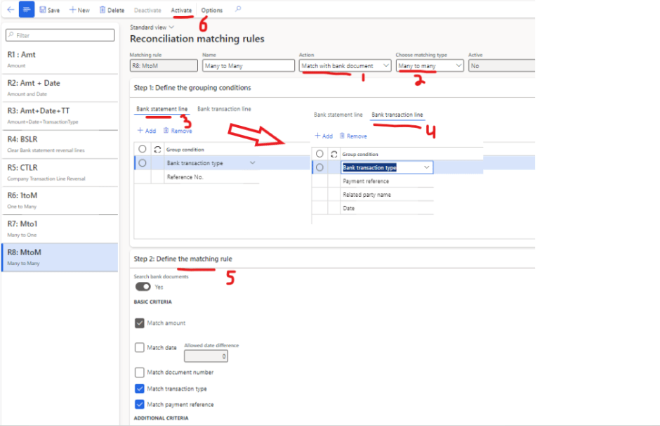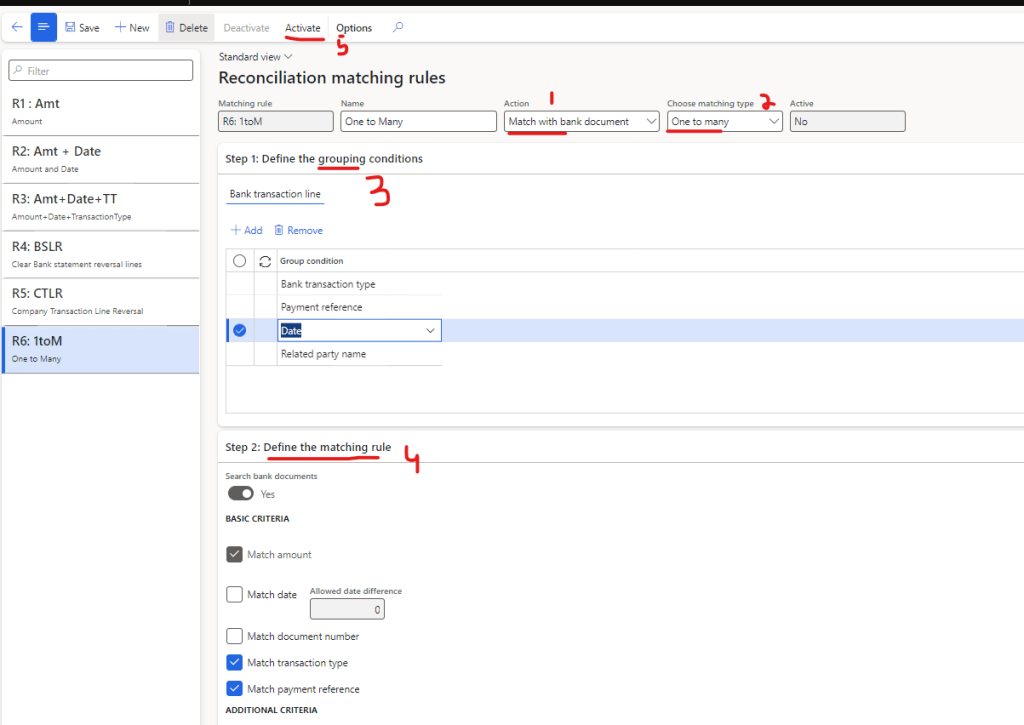 - In Matching rule we will define that how our grouped transaction is going to be matched with D365 bank transactions.