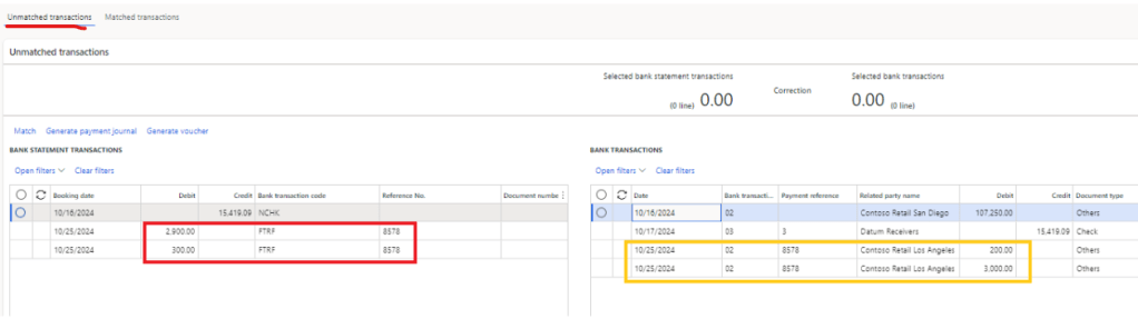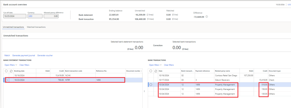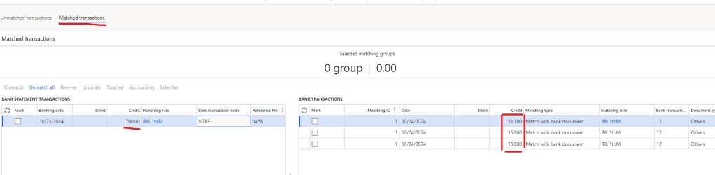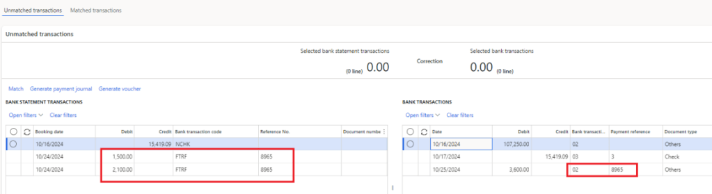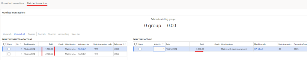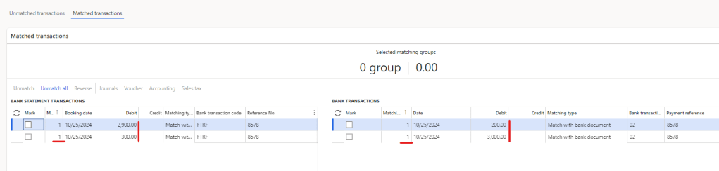 In each grid, I have two transaction lines that meet the grouping criteria, though the individual line amounts don’t match. However, the payment reference, bank transaction code (type), and total amount align with the matching rule. Therefore, these two bank statement lines should be reconciled with the two D365 bank transaction lines.