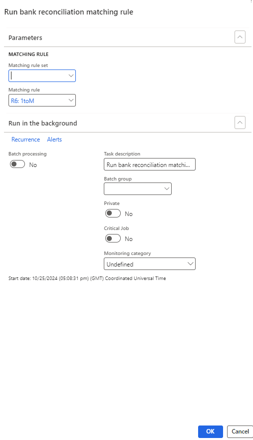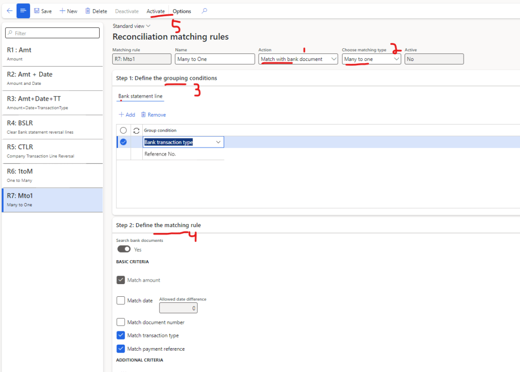 In a many-to-one scenario, multiple transactions in the bank statement may correspond to a single transaction in D365 bank transactions. For this type of scenario, we can configure the matching rule as follows: