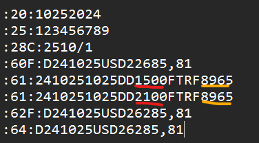 I’ve a MT940 file which show two transactions of 1,500 USD and 2,100 USD and it have a reference number 8965