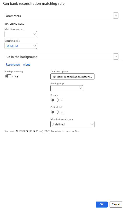 In a many-to-many scenario, we aim to match multiple bank statement lines with multiple D365 bank transactions. For this type of scenario, we can configure the matching rule as follows: