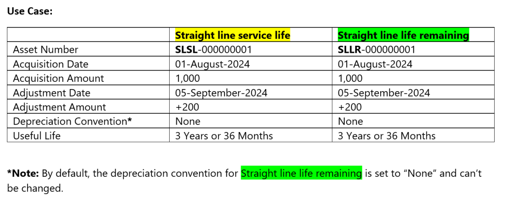 Straight line life remaining: After posting the adjustment, system automatically calculates the depreciation amount based on the remaining useful life of particular asset so that the Net book value reaches zero at the end of its useful life.